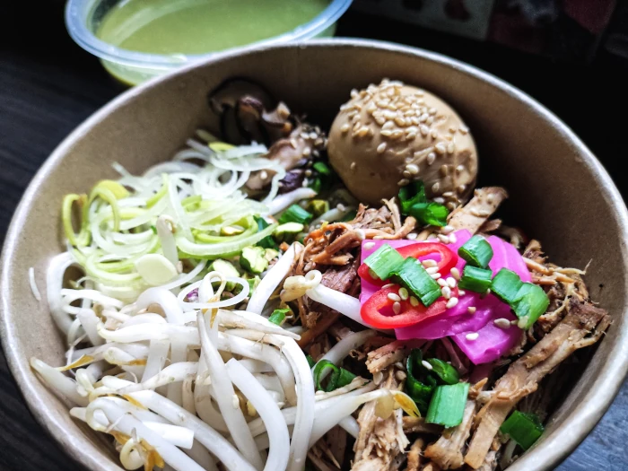 Lubimy restauracje z krótkim menu i imponują nam koncepty, które potrafią wystartować w konkursie z tylko jednym daniem (zobacz: Pastrami Summer), dlatego od razu zaświeciły nam się oczy, gdy w menu zobaczyliśmy... raptem trzy pozycje: Ramen, Tom kha i Tom yum. Próbowaliśmy ramenu i tom yum (oba wyśmienite), po jakimś czasie pojawił się też ramen pistacjowy... i to na niego skusiliśmy się tym razem.