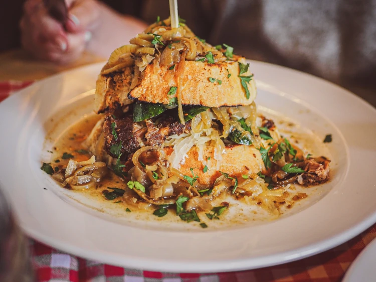 Rodzice uraczyli się plackami po zbójnicku z gulaszem wołowym i sosem grzybowym (45 złotych).
