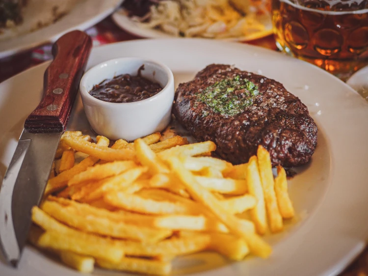 No niestety, ale wegetarianie i weganie w tym wpisie nie znajdą zbyt wiele dla siebie, bo zdecydowaliśmy się na typowy, mięsny, solidny obiad. Mąż jako miłośnik wołowiny zdecydował się na popisowe danie restauracji, czyli siekanego steka "Sukiennice" z masłem ziołowym, sosem z zielonego pieprzu (55 zł) i dodatkiem frytek (12 zł).