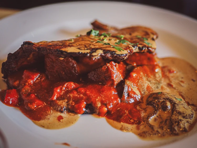 I czegóż można chcieć więcej, jak chrupiącego placka ziemniaczanego, mięciutkiej wołowiny, idealnego sosu zaciągającego lekko z węgierska pieczoną papryką i całych grzybów w sosie grzybowym?