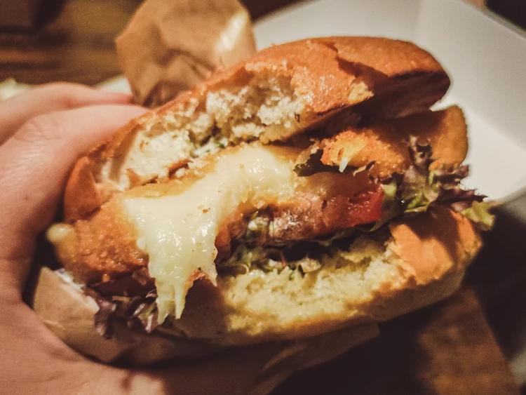 Gdy tylko zobaczyłam w menu pozycję ze smażonym serem, od razu wiedziałam, że to będzie mój wybór. W tej samej cenie, co mięsną bułę, można sobie zamówić wersję z panierowanym radamerem w kultowym towarzystwie sosu tatarskiego, pomidora i zieleniny.