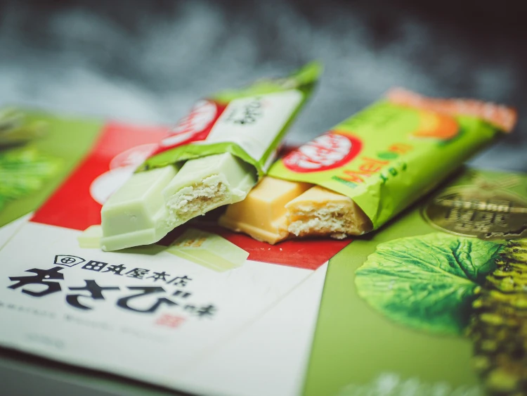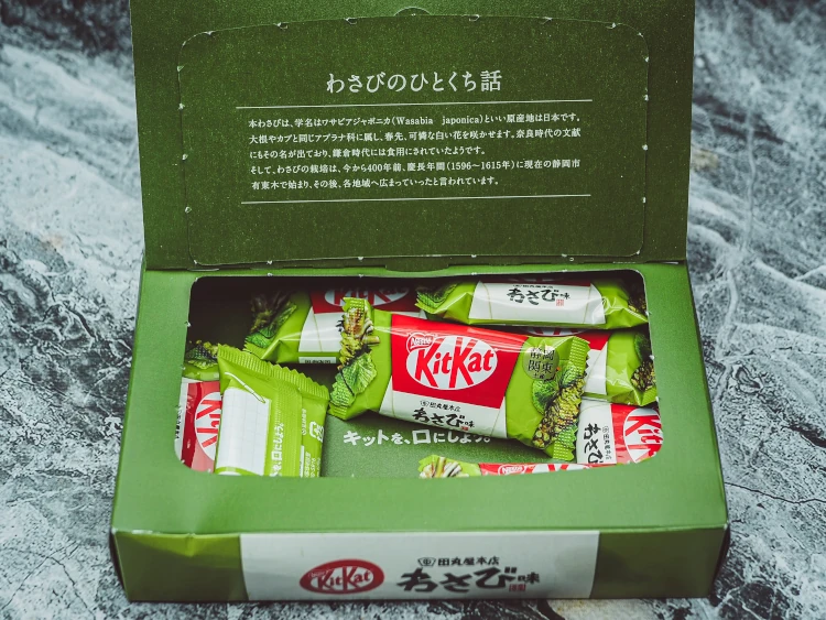 Tak, Kochani, to są KitKaty o smaku wasabi, tego ostrego, zielonego chrzanu, który zazwyczaj asystuje nam przy wsuwaniu sushi i wychodzi nosem wywołując łzy w oczach, gdy nieopacznie nałożymy go za dużo. Szczerze? To jest ten moment kiedy zaczynam się bać i nerwowo przełykam ślinę, odkładając moment spróbowania tegoż cuda.