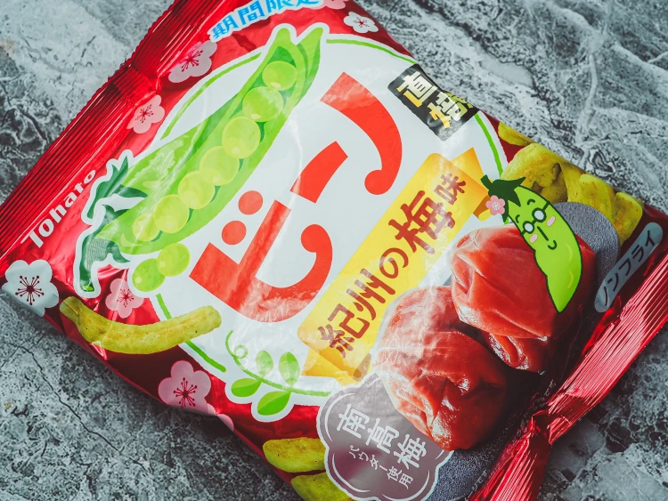 Limitowana wiosenna edycja groszkowych chrupek Tohato o smaku śliwek ume nankō