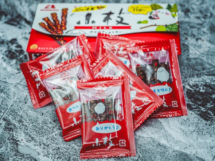 Dobra, do czekoladek z chrupeczkami podejście drugie, i równie kultowe. Koeda Chocolate to gałązki czekoladowe, które są sprzedawane przez firmę Morinaga od 1971 roku, czyli również od ponad pięćdziesięciu lat. Firma uważa, że byli wręcz częścią większej kampanii, która przyczyniła się do popularyzacji Walentynek i dawania z tej okazji czekoladek jako części japońskiej kultury.