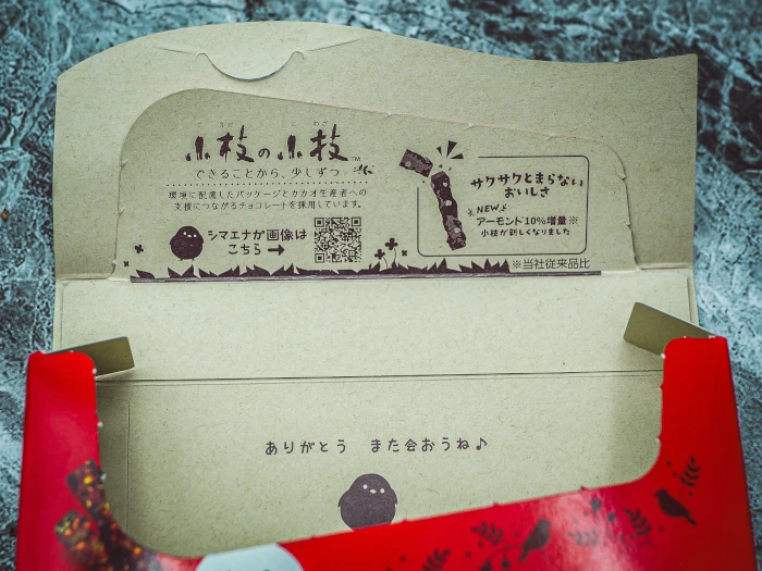 Po pierwsze - czekoladki są pakowane w mniejsze paczuszki po cztery "gałązki". Na każdej paczuszce jest uroczy "pingwinek" (?) i miły napis jak "ありがとう" (arigatou, czyli "dziękuję") czy "おつかれ" (otsukare, czyli "dobra robota"). Są przez to świetne, żeby dorzucić je komuś jako drobny upominek.