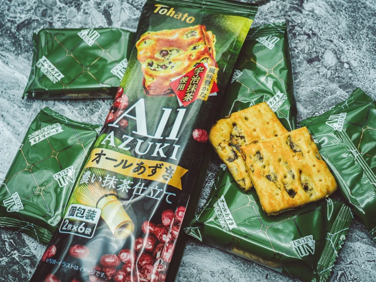 Ciasteczka z kawałkami słodkiej fasoli i dodatkiem zielonej herbaty matcha od Tohato