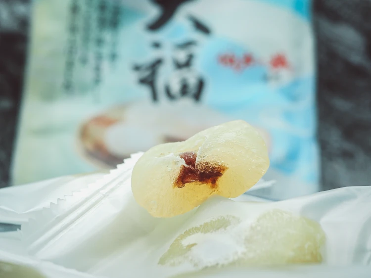 Te mochi mają zupełnie inną teksturę od poprzedników - są dużo bardziej elastyczne, o strukturze dużo mniej podobnej do galaretek. Ciasto jest bardzo klasyczne i delikatnie słodkie, a nadzienie delikatnie chrupie stanowiąc do niego doskonałą przeciwwagę.
