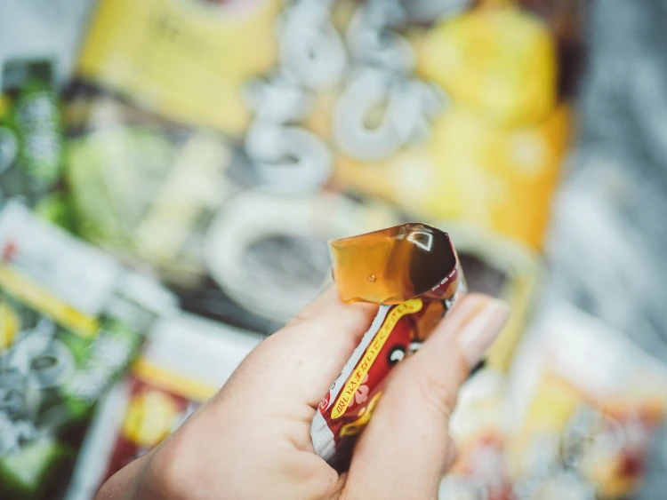 Galaretki je się bezpośrednio z niewielkiej saszetki i mają one iście kosmiczną konsystencję. Niby galaretka jak galaretka, wygląda nawet jakby była lekko płynna, a pod językiem jest zaskakująco zwarta i stawia dość wyraźny opór. Nieco podobna do dostępnych u nas deserków z konjacu.