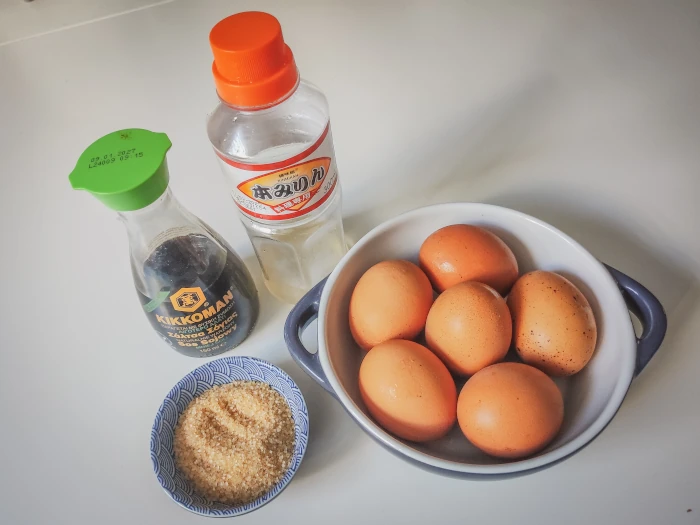 Przygotuj zalewę: sos sojowy, mirin i cukier wymieszaj i podgrzej w rondelku lub na małej patelni do rozpuszczenia cukru. Przygotowaną mieszanką zalej jajka.