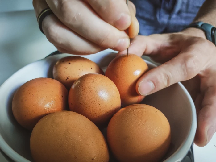 Możesz nakłuć szerszą stronę jajka pinezką lub szpilką - nie jest to konieczne, jednak zapobiegnie pękaniu jajek w trakcie gotowania.