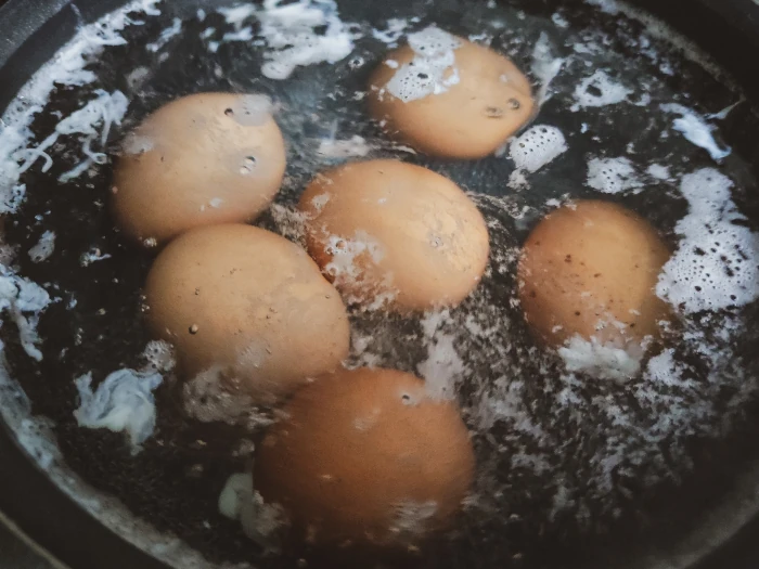 Ostrożnie włóż łyżką jajka do gotującej się wody. Gotuj około 6 minut (aby żółtko nie było ani płynne, ani całkowicie ścięte).