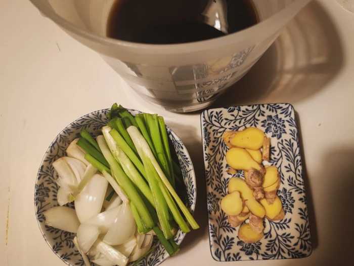 Płynne składniki wymieszaj. Białą część dymki pokrój w grube piórka, zieloną w mniejsze fragmenty. Imbir bez obierania pokrój w plasterki.