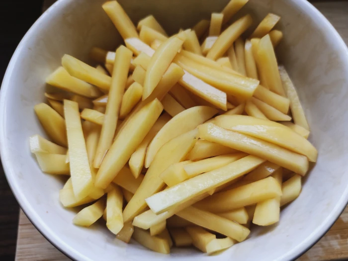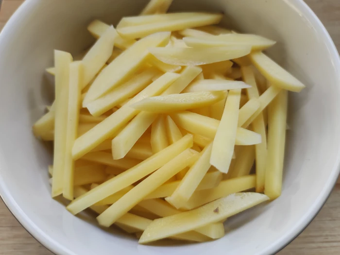 Ziemniaki obierz i pokrój w słupki o szerokości około 2 milimetrów.