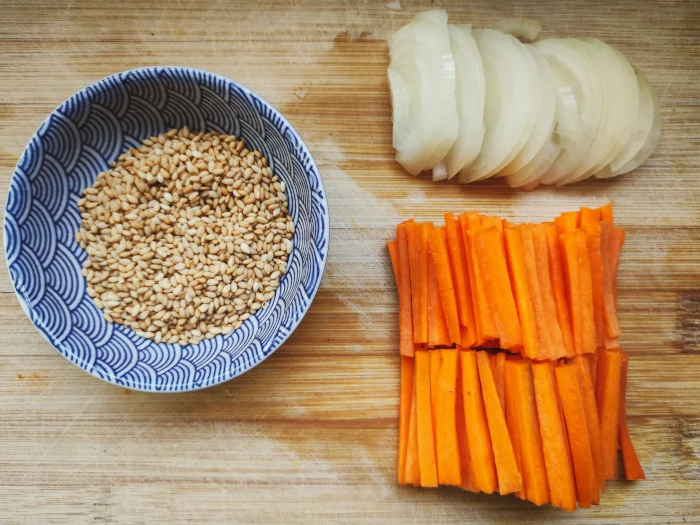 Ja zazwyczaj kupuję już uprażony sezam importowany z Korei, ale jeżeli masz zwykły, w tym momencie go przygotuj - podpraż chwilkę na suchej patelni, aby się lekko zarumienił, ale nie spalił.