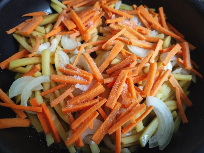 Na patelni rozgrzej olej do smażenia. Na gorący olej dodaj ziemniaki, marchew i cebulę. Dodaj dużą szczyptę soli i smaż co jakiś czas mieszając aż warzywa będę miękkie.