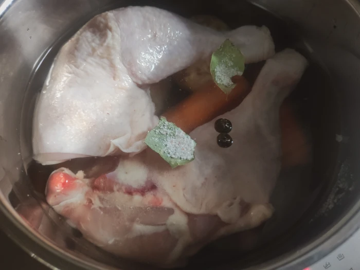 Do garnka wrzuć mięso z kurczaka i obrane warzywa, dodaj sól, liść laurowy i ziele angielskie. Zalej wodą tak, aby przykrywała mięso. Zagotuj na dużym ogniu, potem zmniejsz ogień i gotuj godzinę.