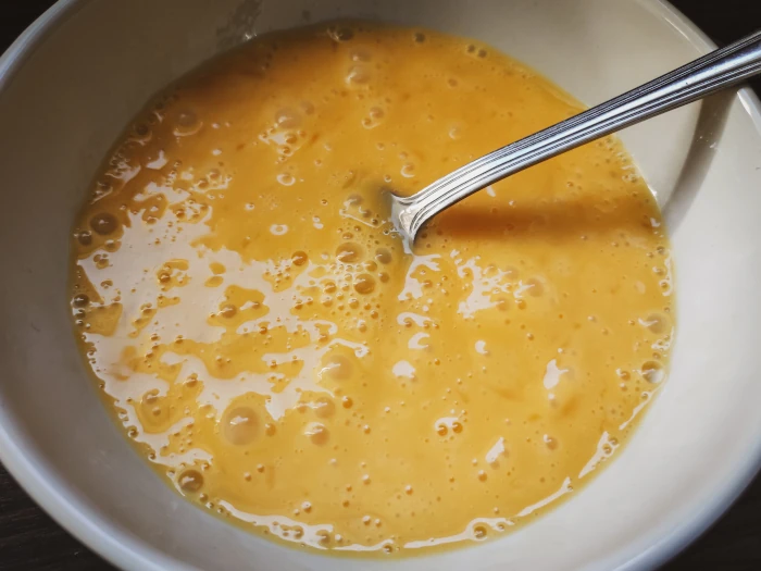 Wstaw wodę na makaron. Jajka wyciągnij z lodówki i roztrzep widelcem.