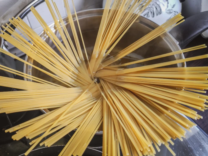 Osól gotującą się wodę i wstaw makaron do gotowania.