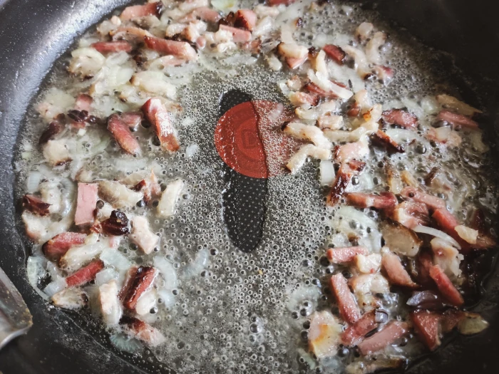Gdy zacznie intensywnie pachnieć, dorzuć boczek i zacznij powoli wytapiać na małym ogniu. Jeśli boczek jest zbyt chudy lub nie chce się wytapiać (sklepowe boczki czasami tak mają ze względu na dodatki do żywności), możesz po jakimś czasie dodać odrobinę masła lub oliwy.