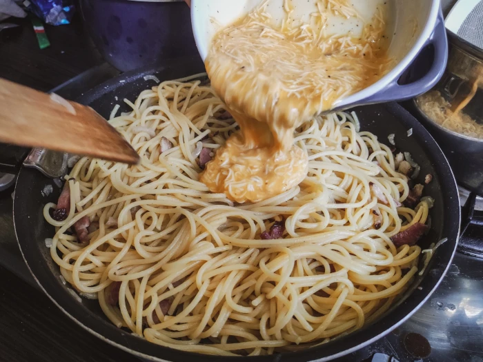 Carbonara jest najlepsza jedzona zaraz po przygotowaniu. Nie nadaje się do odgrzewania, nie lubi tego ani makaron, ani tym bardziej sos z jajek.