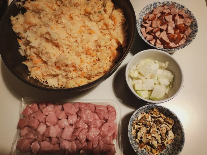 Przygotuj składniki: cebulę, szynkę i kiełbasę pokrój w kostkę. Grzyby połam w rękach. Kapustę z grubsza odsącz (ja prawie tego nie robię) i pokrój w mniejsze kawałki, żeby się nie "ciągła" .