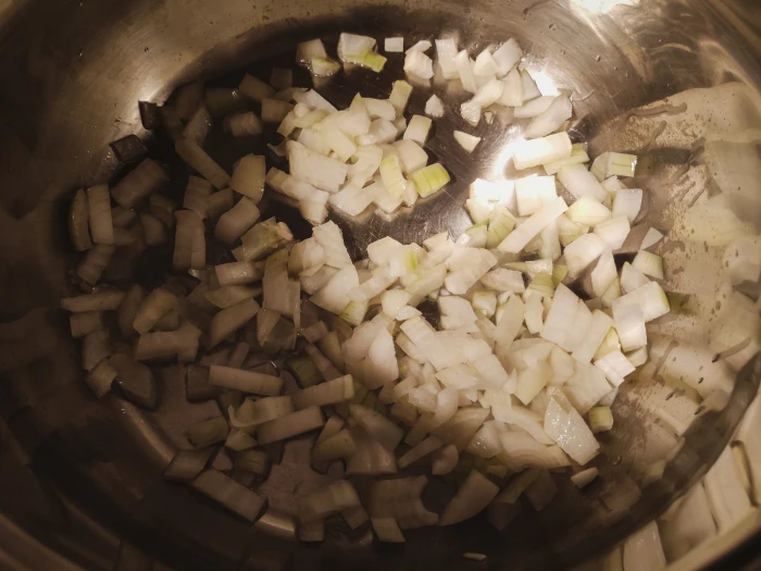 Zeszklij cebulę. W garnku na dużym ogniu rozgrzej olej, wrzuć cebulę i poczekaj, aż lekko się zarumieni.