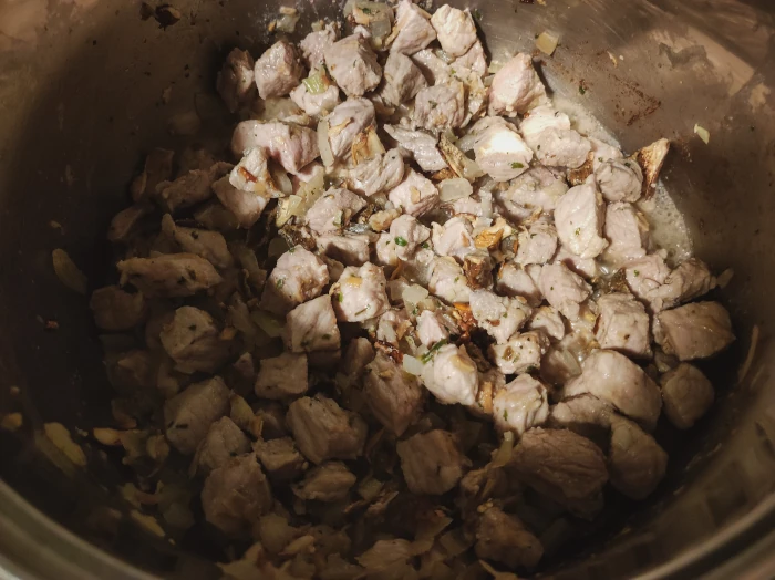 Dorzuć mięso. Obsmaż, aż się zarumieni. Jeżeli zacznie puszczać wodę, dodaj grzyby. Jeżeli nie, dodaj je na końcu smażenia.