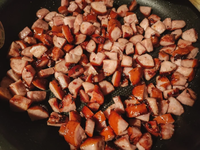 W międzyczasie podsmaż kiełbasę aż się zarumieni. Możesz to zrobić na odrobinie tłuszczu (ja zazwyczaj nie dodaję, bo sama kiełbasa jest wystarczająco tłusta). Ściągnij z ognia.