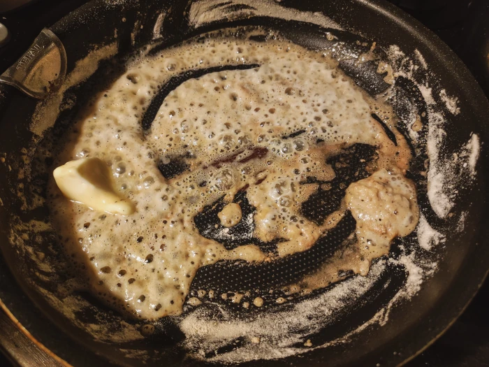 Przygotuj zasmażkę. Na suchej patelni na średnim ogniu podsmaż mąkę i co chwilę mieszaj, uważając, żeby jej nie spalić. Gdy zacznie się lekko rumienić i inaczej pachnieć, dodaj masło. Wymieszaj i wyłącz palnik. Całość powinna być delikatnie brązowa.