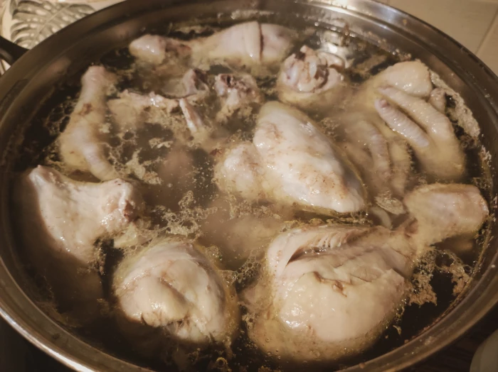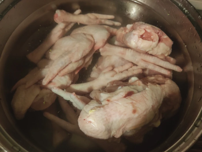 Obetnij paznokcie z kurzych łapek. Umieść mięso w dużym garnku i zalej wodą. Doprowadź do wrzenia i zmniejsz ogień. Gotuj przez godzinę.