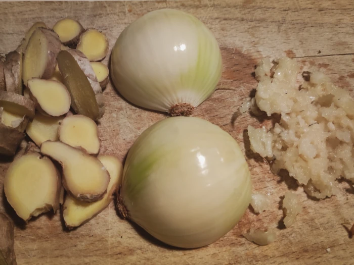 Około godzinę przed końcem gotowania przygotuj warzywa: cebulę przekrój na pół, imbir pokrój w plasterki, a czosnek obierz i przeciśnij przez praskę lub zblenduj.