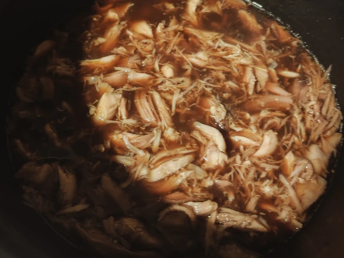 W duchu "zero waste" lubię też wykorzystywać mięso z bulionu, czego praktycznie nigdy nie widuję w oryginalnych przepisach. Jednak spokojnie obrane mięso możemy zalać "marynatą z recyklingu" po chashu lub jajkach i nie będzie ono odstawało od bardziej wyszukanych dodatków.