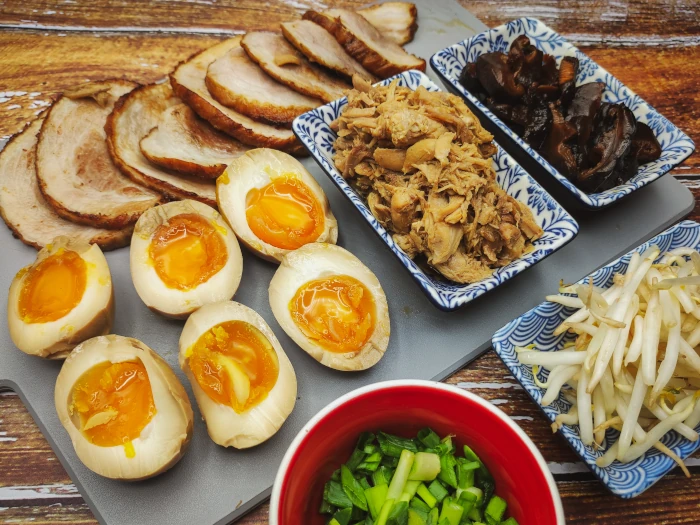 Przygotuj wszystkie składniki. Boczek pokrój w plastry i opal/podsmaż. Jajko przekrój na pół. Mięso wyjmij z marynaty, przygotuj marynowane shiitake. Kiełki opłucz (opcjonalnie możesz wymieszać z odrobiną oleju i gochugaru), zieloną część dymki pokrój do posypania.