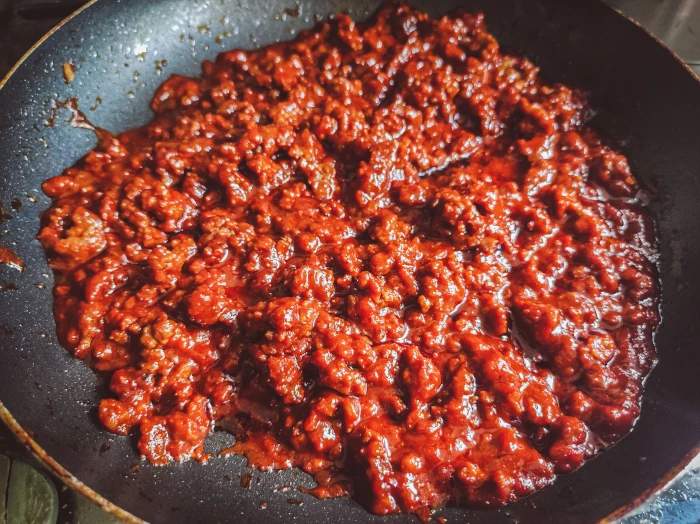 Dlatego od razu dodaj mięso i dokładnie wymieszaj. Smaż na nieprzesadnie dużym ogniu tylko do momentu, aż mięso przestanie być surowe.
