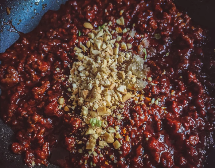 Całość warto spoić sosem - najczęściej jest to ssamjang (mix gochujang i doenjang z dodatkami), jednak my przygotujemy smażony sos z wołowiną yak gochujang. Jest bardzo ostry, więc jeśli nie jecie ostrego - zastąpcie go np. słodkim sosem chili.