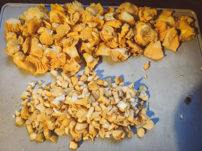 Następnie pokrój kurki - nóżki dość drobno, kapelusze zostaw w całości lub przekrój na pół.