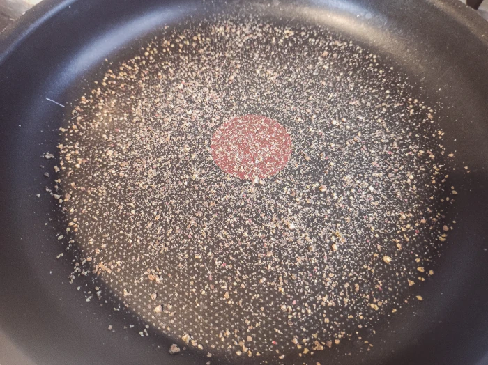 W tym celu rozgrzej suchą patelnię, prosto na nią zmiel dość grubo pieprz. Praż chwilę, aż zacznie intensywnie pachnieć.