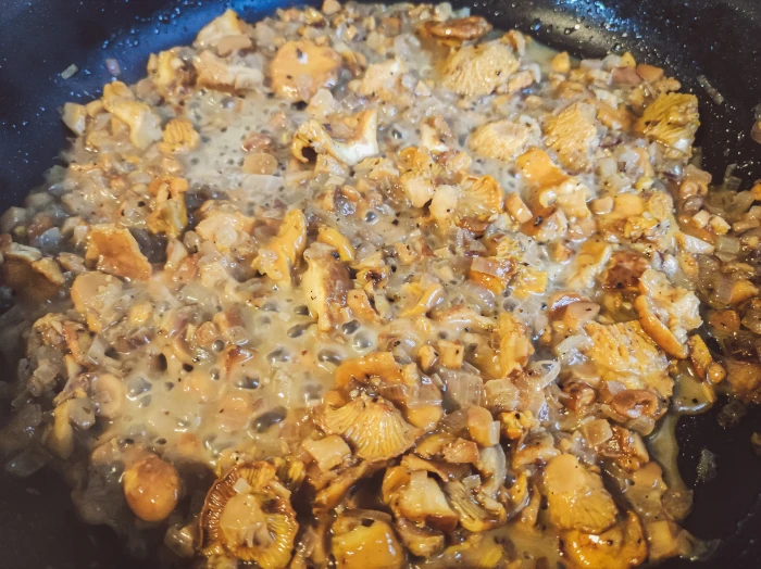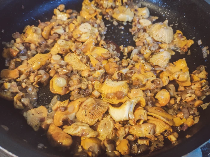 Dodaj kurki: najpierw dodaj nóżki od kurek i smaż około 5 minut. Na koniec dodaj kapelusze i smaż przez kolejne 5 minut.