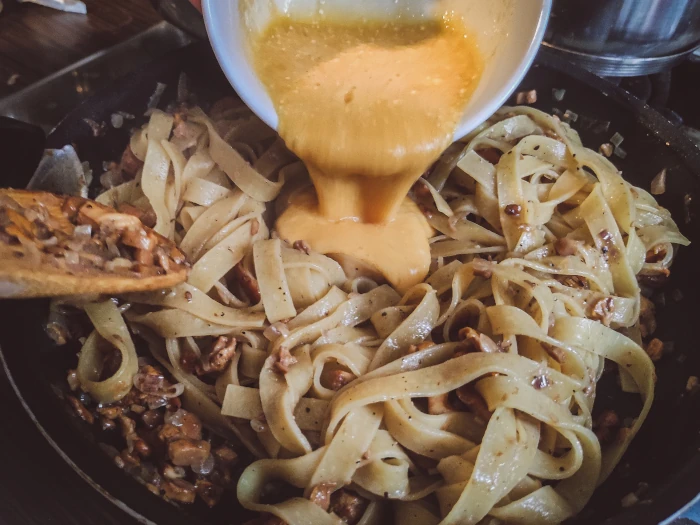 Carbonarę je się zazwyczaj z makaronem spaghetti, jednak do tego wariantu bardzo polecam wam świeży makaron, na przykład tagliatelle. W tak jakościowym, delikatnym połączeniu będzie on doskonale podkreślony, otulony i wyniesiony na makaronowy piedestał. To jest po prostu połączenie doskonałe - niby banalnie proste, ale jednak takie jakby luksusowe...