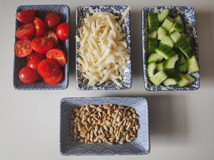 Ser zetrzyj na tarce na grubych oczkach, pomidorki przekrój na pół, ogórka pozbaw wodnistych gniazd nasiennych (np. łyżeczką) i pokrój na mniejsze kawałki. Słonecznik upraż przez chwilę na suchej patelni.
