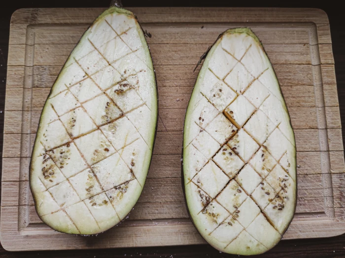 Wyciągnij bakłażany z piekarnika i odstaw na chwilę, żeby lekko przestygły.