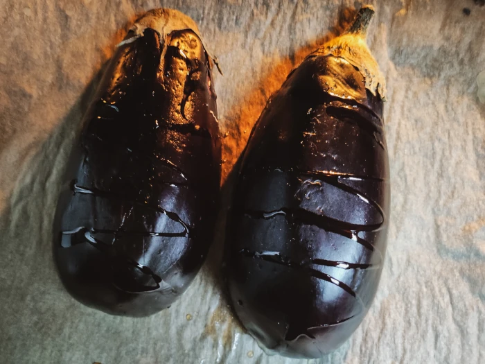 Posmaruj po obu stronach oliwą/olejem i wstaw do piekarnika ustawionego na 200°C. Piecz, aż bakłażany zmiękną (około 15-20 minut, można to sprawdzić widelcem lub szpikulcem).