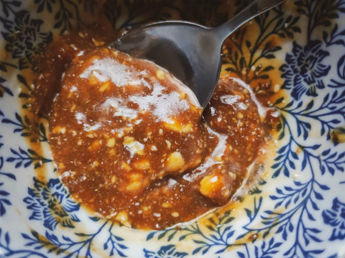 W międzyczasie przygotuj glazurę: w miseczce wymieszaj pastę miso, masło, olej sezamowy, miód i ocet ryżowy.