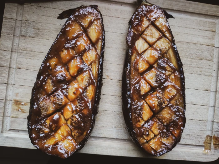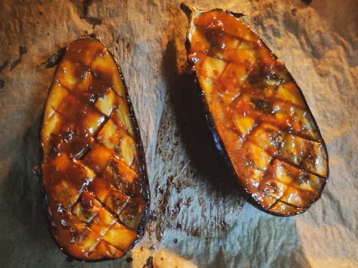 Gdy bakłażan zmięknie odwróć go na drugą stronę i posmaruj glazurą. Piecz jeszcze przez 5-10 minut aż glazura lekko się skarmelizuje.