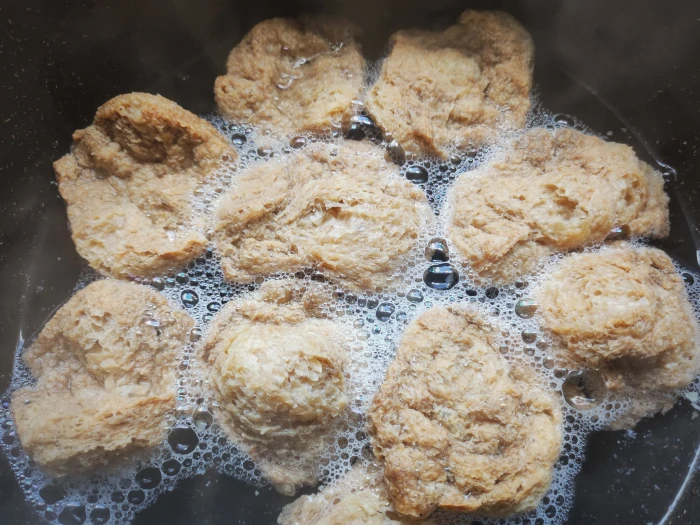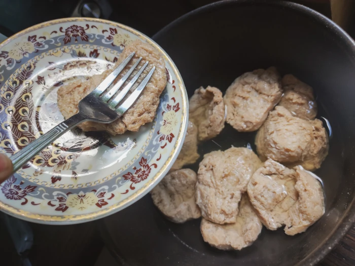 Kotlety sojowe zalej gorącą wodą i przykryj talerzykiem na około 10 minut, aż zmiękną.