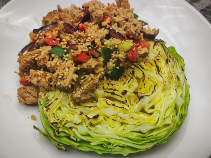 Syta orzechowa sałatka z kaszą bulgur i soją na młodej kapuście