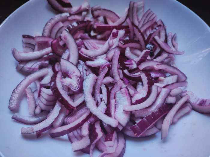 Pokrój cebulę w półpiórka, zasyp dwoma szczyptami soli i polej kilkoma kroplami soku z cytryny lub zaprawy. Z grubsza wymieszaj i odstaw, by puściła sok.