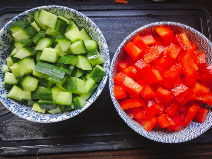 Z ogórka odetnij końcówki, wydrąż nasiona i pokrój w podobnej wielkości kostkę.