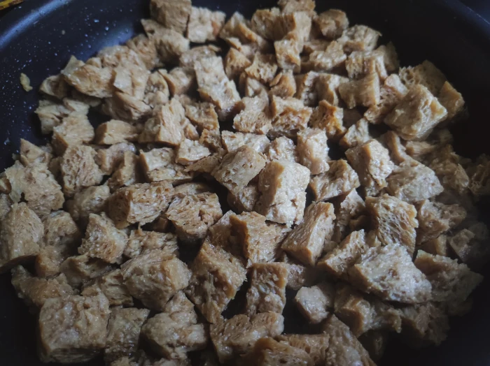 Na patelni rozgrzej odrobinę oleju, wrzuć pokrojone kotlety sojowe. Wlej dwie łyżki sosu sojowego i wymieszaj. Podsmaż minutkę i ściągnij z ognia.