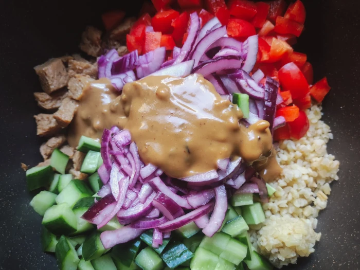 Do miski wrzuć ugotowaną kaszę, paprykę, ogórka, cebulę i kotlety sojowe. Zalej przygotowanym sosem i wymieszaj. W razie potrzeby dopraw odrobiną soli.